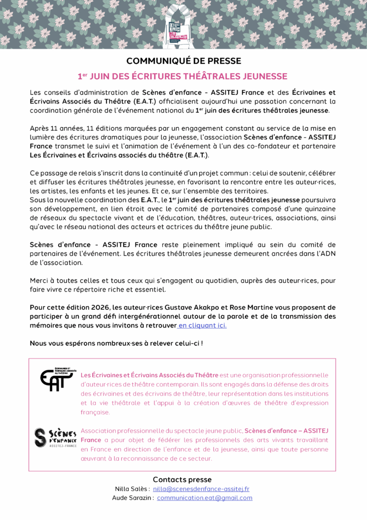 Retour aux actualités Communiqué de presse : 1er juin des écritures théâtrales jeunesse Document à télécharger